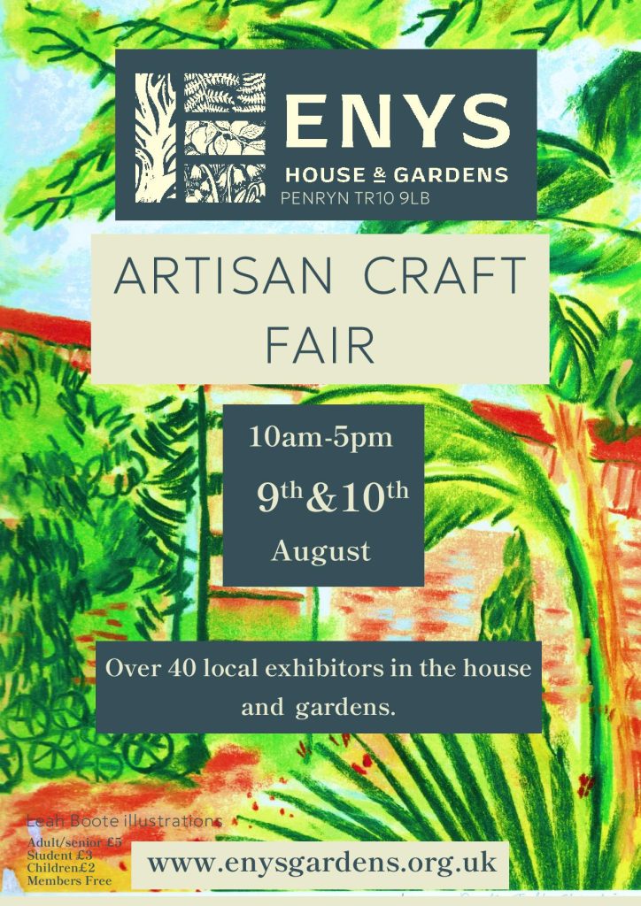 Enys Calendar Craft Fair 10:00 AM – 5:00 PM9 Aug 2025 Back by popular demand, the Craft Fair is a great favourite - come and see the works of local artisans in the beautiful surroundings of Enys! View full calendarOnline ticket sales for this event are closed.